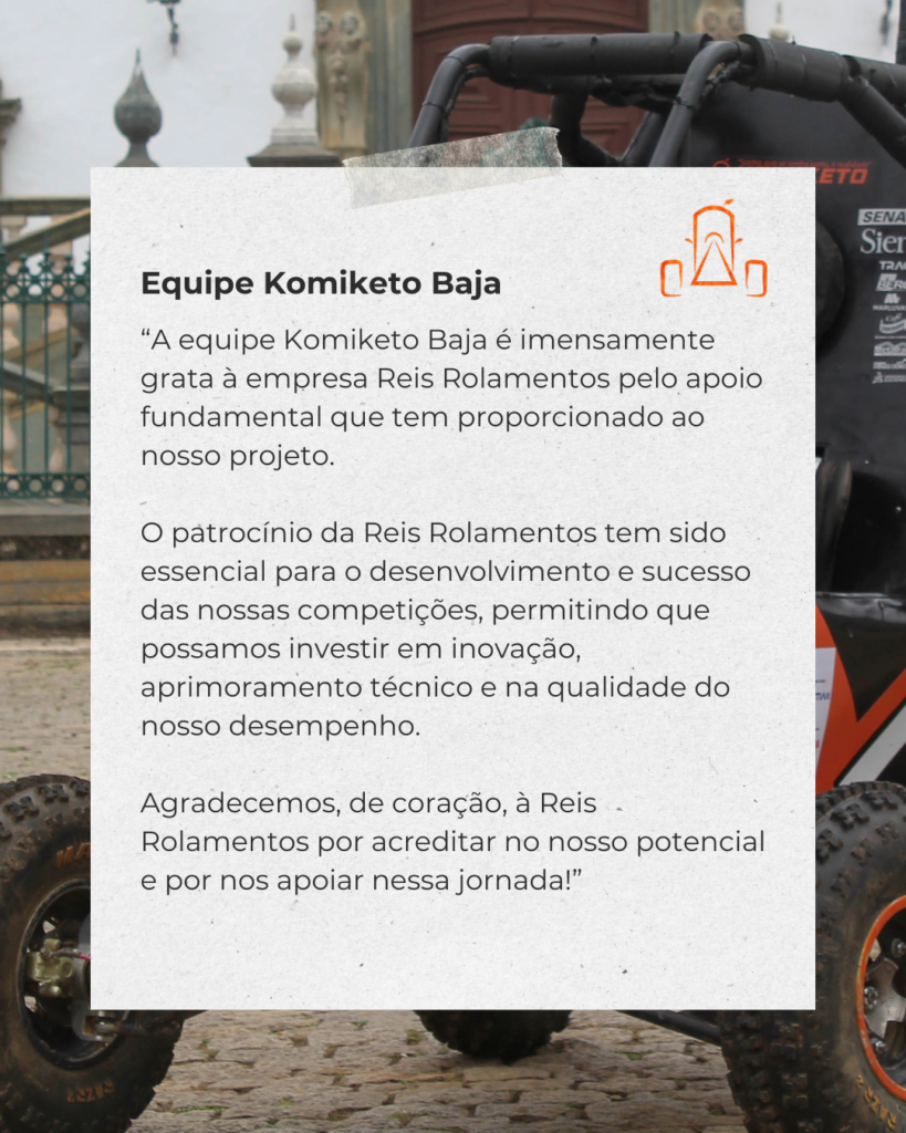 A Reis Rolamentos apoia projetos da Universidade Federal de São João del Rei (UFSJ), fornecendo peças para iniciativas de engenharia como Komiketo Baja, Milhas Gerais e Fórmula Del Racing. Com foco em responsabilidade social, incentivamos o desenvolvimento de engenheiros e o futuro da inovação.